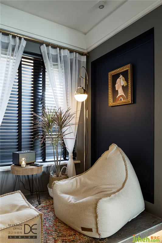 休閑角落以深藍色和灰色為主調(diào),落地?zé)羧岷偷墓猓由习偃~窗透出的絲絲光線,讓人只想在這里聽著音樂喝著咖啡,安安靜靜地享受精致的下午時光。