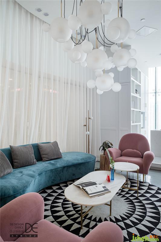 休息區(qū)域頂面泡泡造型的燈具與擴散狀花紋的地毯相呼應(yīng),粉藍色沙發(fā)更是吸睛的存在。在這里,顧客可以盡情享受悠閑時光。