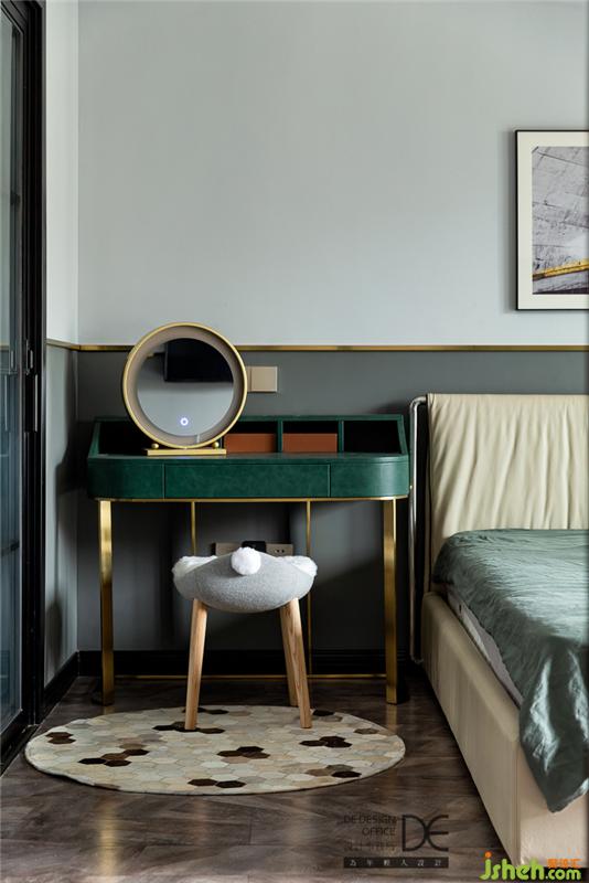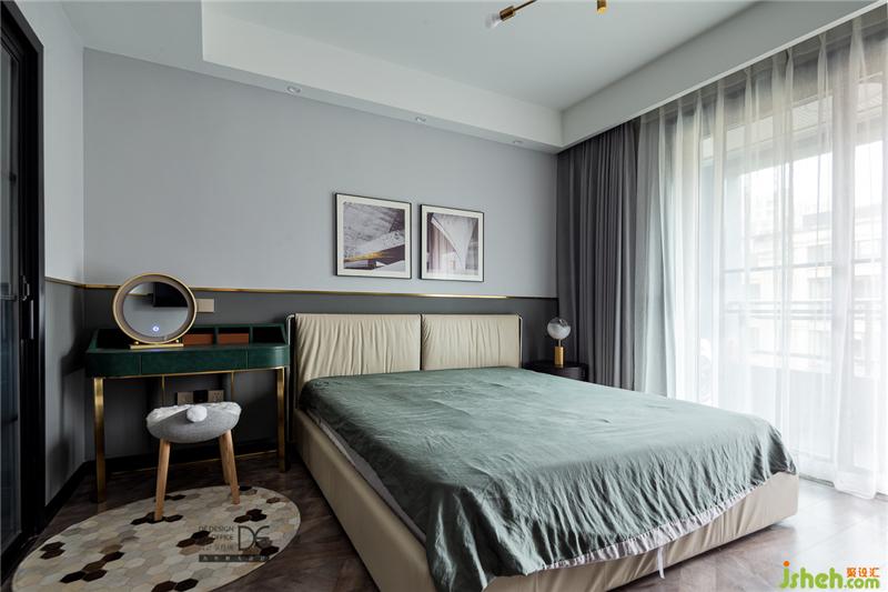 主臥以灰色為基調(diào),加入綠色點綴,清爽而溫暖。背景掛畫與地面紋理相照應,和諧舒適感油然而生,金屬線條的裝飾,更是為這個空間添色不少。