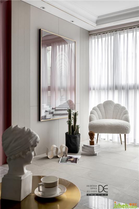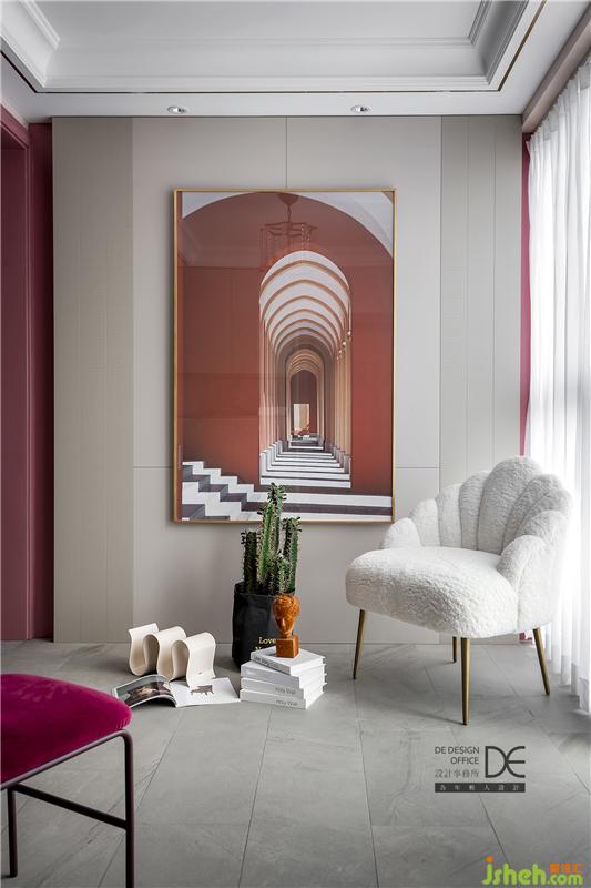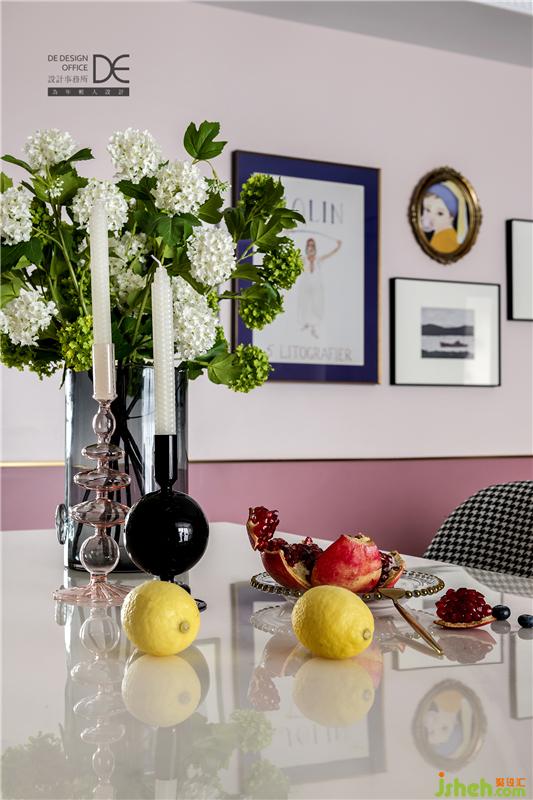 墻面金色不銹鋼線條讓粉嫩的空間多了幾分硬朗,花藝也為這里增添了不少生機(jī),彰顯出主人精致的生活品質(zhì)。甜甜氣息充滿了整個(gè)空間,仿佛一杯Pink Mojito,賦予空間不一樣的浪漫。