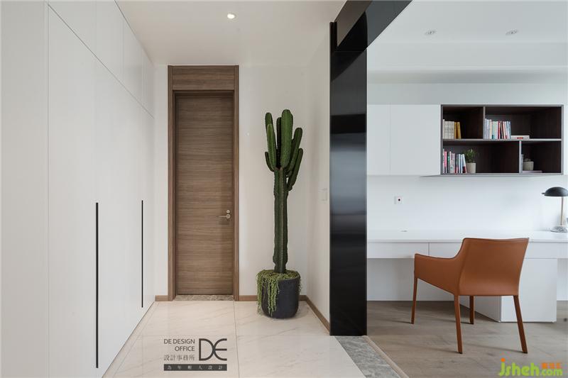 開(kāi)放式書(shū)房位于二層空間,大面積的白色與過(guò)道的整面櫥柜相呼應(yīng),清新綠植、實(shí)用雙人桌、復(fù)古色單椅等元素相結(jié)合,落落大方之余,實(shí)用而耐看,營(yíng)造了滿(mǎn)滿(mǎn)的愜意感。