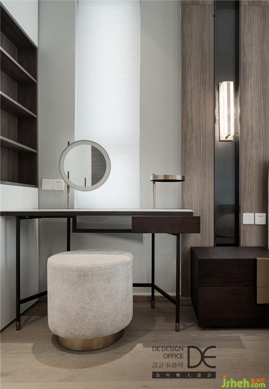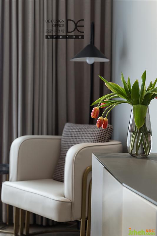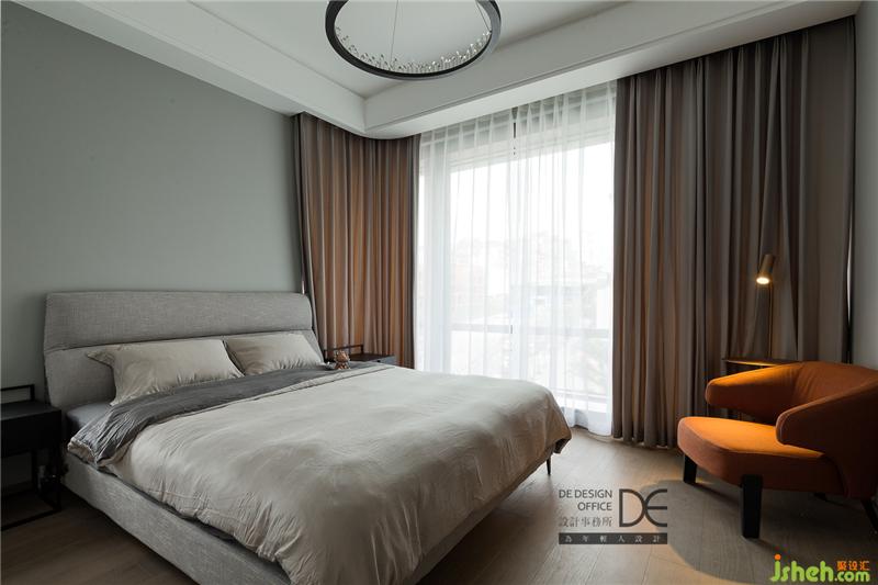在重新規(guī)劃了戶(hù)型結(jié)構(gòu)之后,老人房依舊足夠?qū)挸ā3练€(wěn)的配色,冷而不冽,單椅和金屬落地?zé)魺o(wú)形中為這里增色不少。