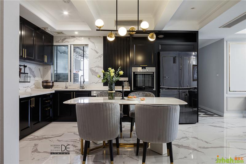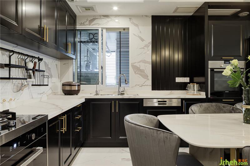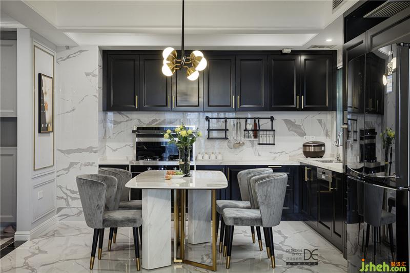 廚房的黑色櫥柜,沉穩(wěn)而干練,黑色中點(diǎn)綴著金色燈具,像是在歲月沉淀的靜郁里綻放出的搖曳生輝的花。