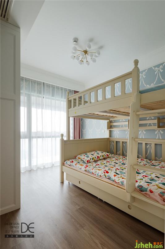 兒童房清雅溫馨,蝴蝶結(jié)背景賦予了小女孩柔軟的公主夢。窗戶做了大面玻璃,拉上窗簾,是隱秘的個人空間;拉開窗簾,也可以與外陽臺進行很好的互動。