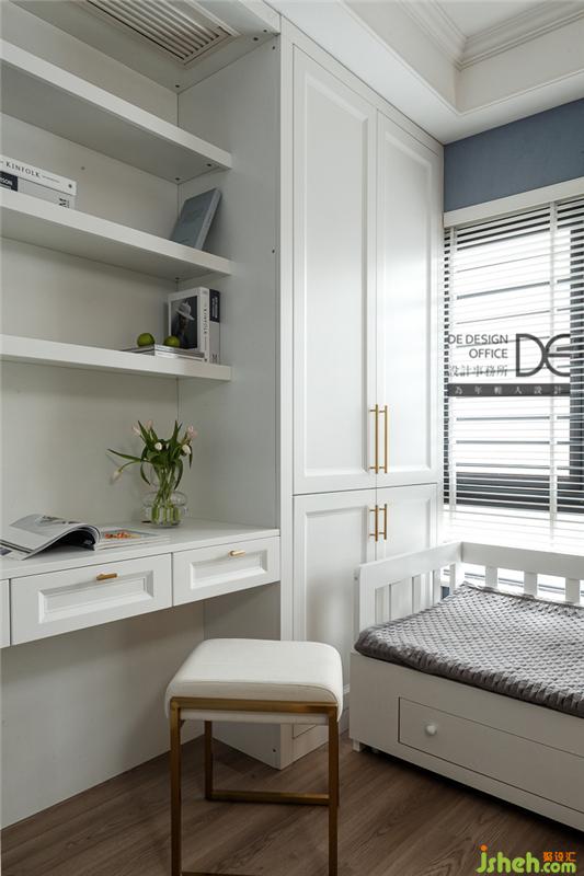 書房主打白色調(diào),加以部分藍色點綴,清新整潔。榻榻米與書柜、書桌的結(jié)合,讓房間功能變得豐富,集儲物收納、學(xué)習(xí)辦公、休息睡眠為一體。