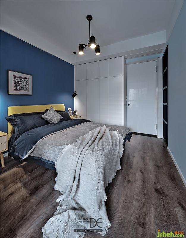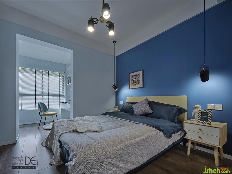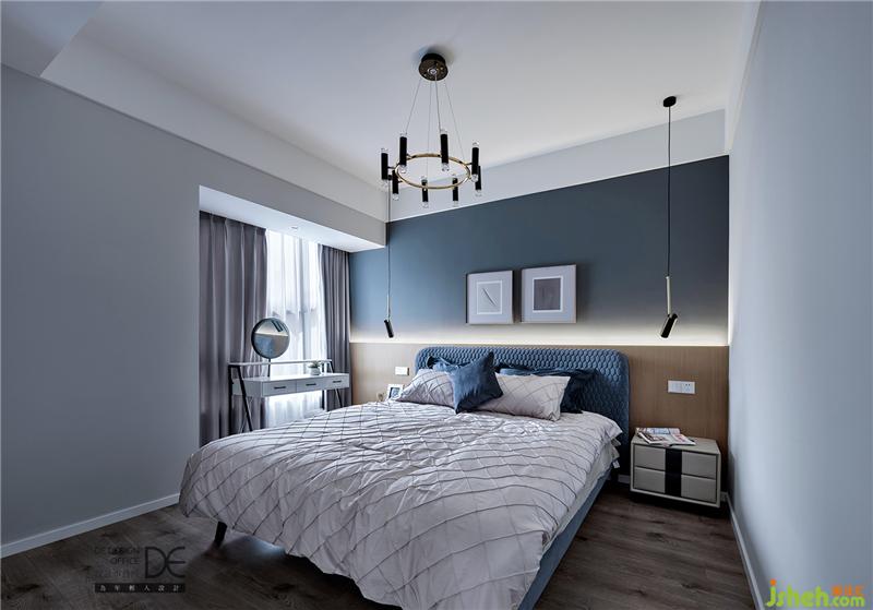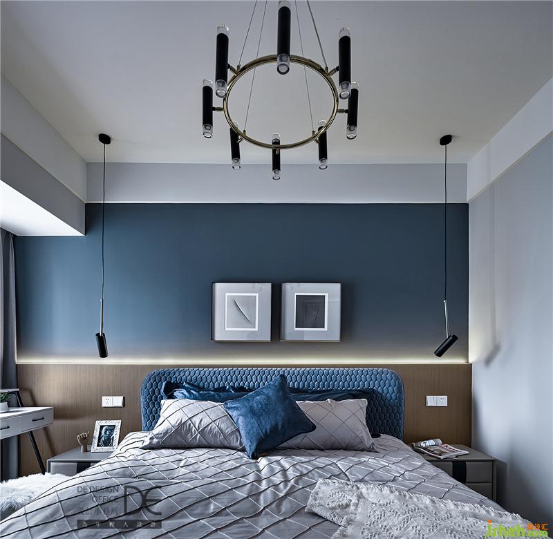 主臥床頭以原木色作為背景裝飾,配以高飽和度的藍(lán)色系藝術(shù)漆,與空間自然融合成一幅「歲月靜好」的畫面。
