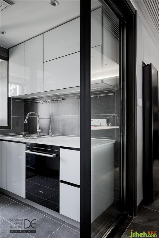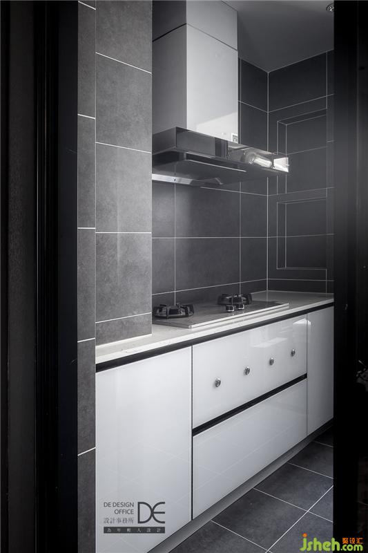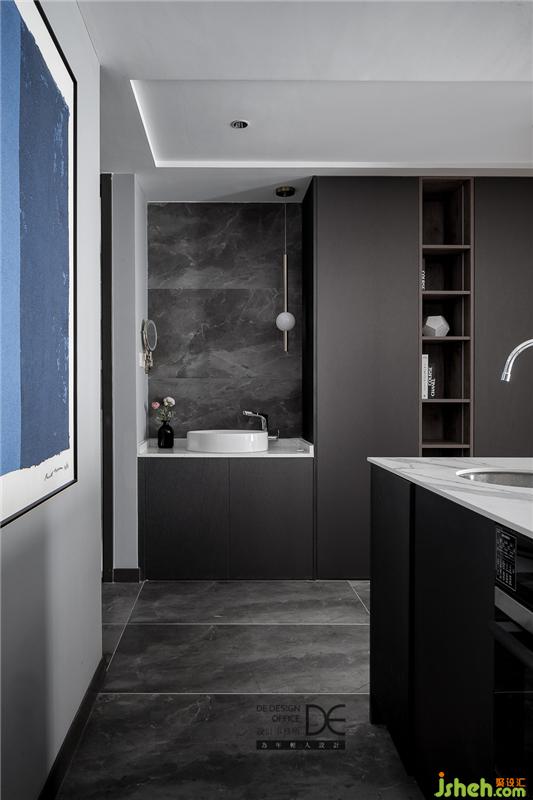 深灰瓷磚搭配白色烤漆柜面,廚房的配色簡單而純粹。在這樣一個干凈的廚房里,期待業(yè)主做出豐富可口的美食,為這個空間帶來更多生活氣息和溫馨色彩。