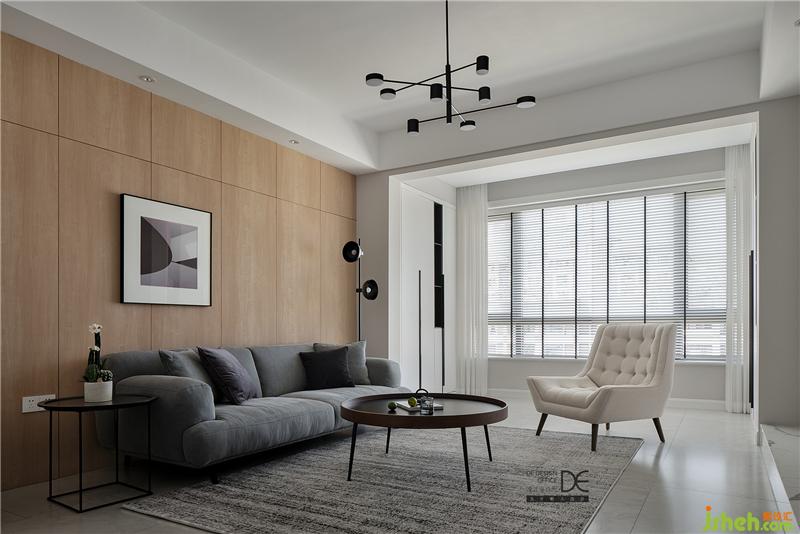 灰色布藝沙發(fā)和灰色地毯提升客廳空間的質感,米白色休閑沙發(fā)椅讓空間更加溫和;白色的收納柜滿足了大量的儲物需求,讓空間整潔有序;簡潔的木飾面板輔以一幅色塊分明的裝飾畫做點綴,沙發(fā)旁邊的圓形落地燈等都讓簡約的空間更加豐滿。