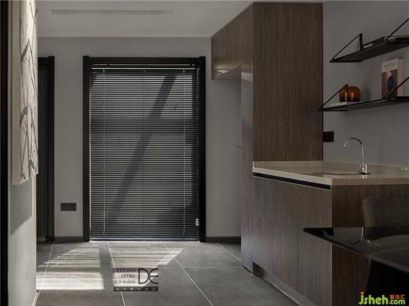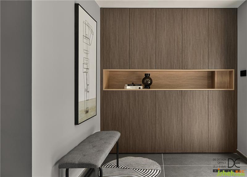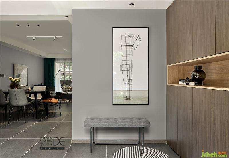 穿過(guò)入戶(hù)花園,進(jìn)門(mén)的第一眼是簡(jiǎn)約的掛畫(huà)和換鞋凳,寬闊的入戶(hù)門(mén)廳采用簡(jiǎn)潔的線(xiàn)條分割和色彩搭配,將黑白灰的感覺(jué)演繹到位,深色的鞋柜拼接木紋色的開(kāi)放格,實(shí)用的同時(shí)讓空間張馳有度。