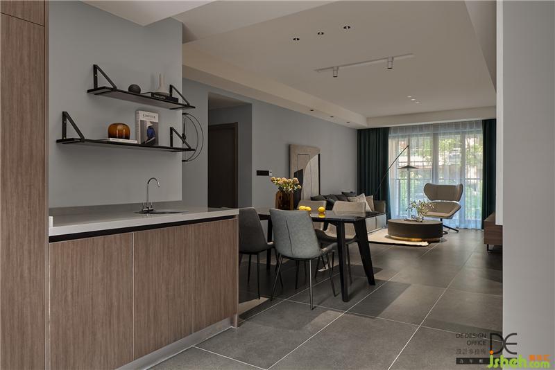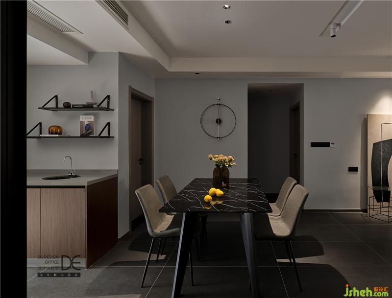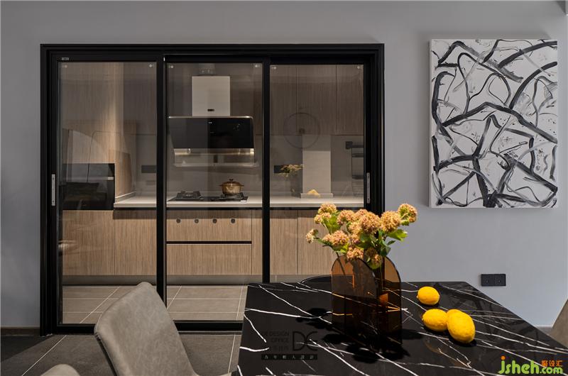客餐廳均采用無(wú)主燈設(shè)計(jì),餐廳燈更是設(shè)置了“聚會(huì)模式”和“浪漫模式”,黑色的大理石餐桌配上皮質(zhì)餐椅,低調(diào)奢華又不失質(zhì)感,旁邊的裝飾畫(huà)則是點(diǎn)睛之筆。廚房門(mén)采用的是三聯(lián)動(dòng)滑門(mén),不用的時(shí)候可以收成一扇,方便進(jìn)出。櫥柜采用原木色的門(mén)板+白色石材,干凈整潔。