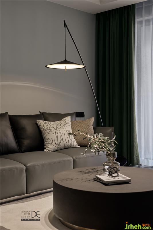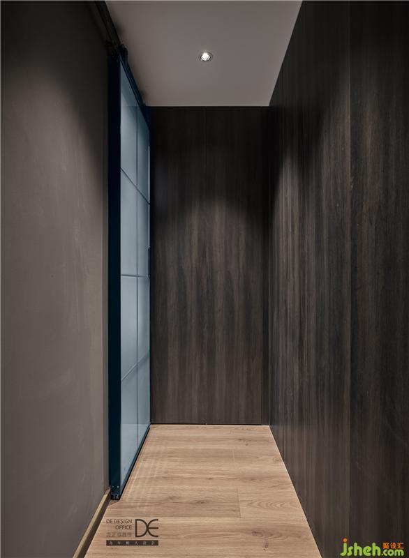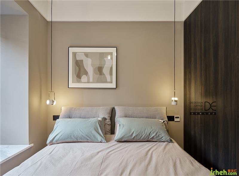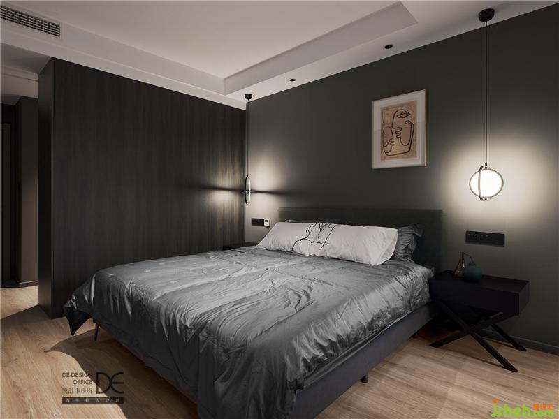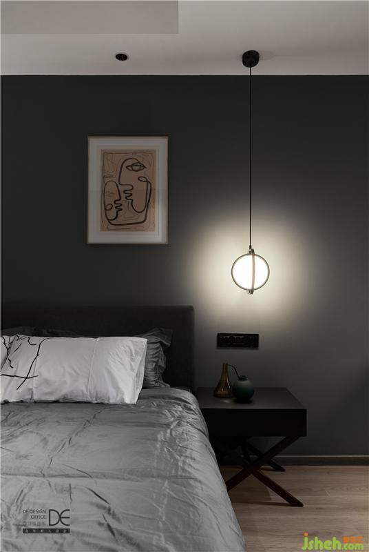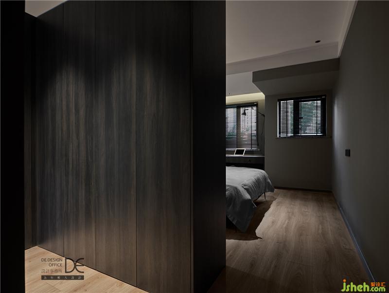 于是,入目即是一眼望到底的黑木紋色柜子,深灰色的乳膠漆,黑色的開(kāi)關(guān)面板和床頭柜,搭配上暖木色的地板,一暗一亮,張弛有度,既中和了黑色帶來(lái)的沉重感,又滿(mǎn)足了業(yè)主的喜好。