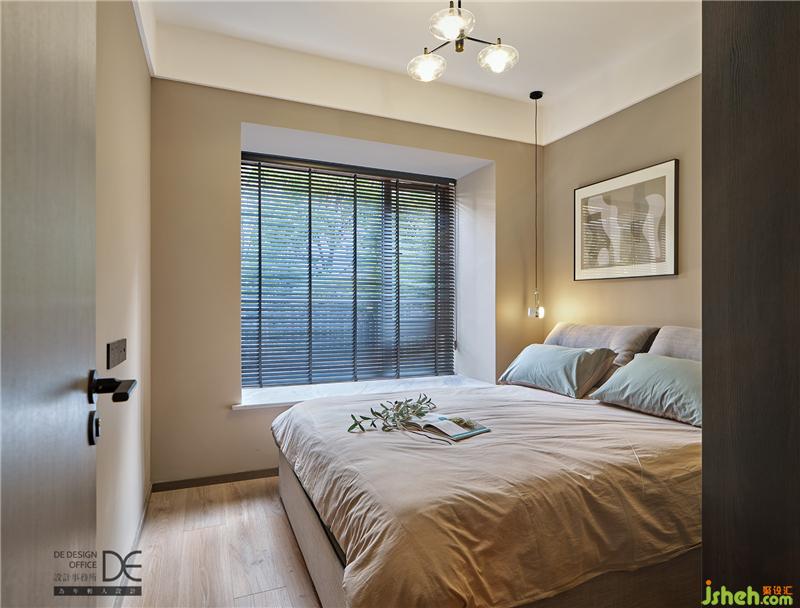 父母房采用了同色系配比,深咖色衣柜和淺咖色的墻面相互對(duì)應(yīng),亞麻色的床品搭配精致小巧的床頭拉線吊燈,溫暖舒適;采用百葉窗最大限度的借景,把入戶(hù)花園的景色引入室內(nèi),保證采光的同時(shí)給空間添上幾分生機(jī)勃勃感。