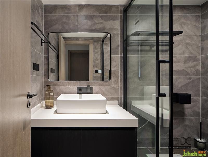 次衛(wèi):黑色邊框的淋浴五金、墻排龍頭和柜子,搭配白色臺(tái)上盆、石材,簡(jiǎn)單又干練。