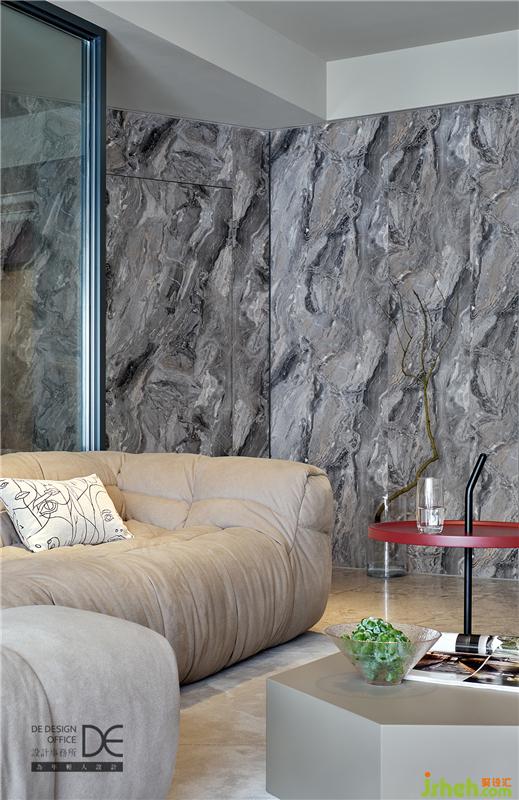 客廳的幕布背后是書(shū)房,用一整面玻璃隔斷,這種處理手法不僅在視覺(jué)上讓空間顯得更加寬敞,而且保證了每個(gè)空間的獨(dú)立,同時(shí)在互不打擾的情況下,書(shū)房里工作的人和客廳里休息的人也互相有了陪伴。