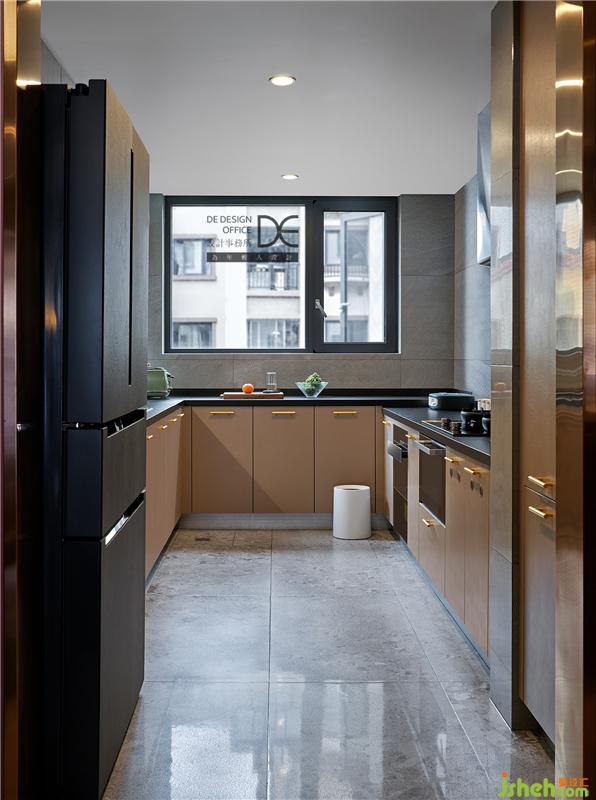 廚房為U型布局,在保證動(dòng)線方便的同時(shí),輔以櫥柜的金屬把手作為點(diǎn)綴,美觀而便利。