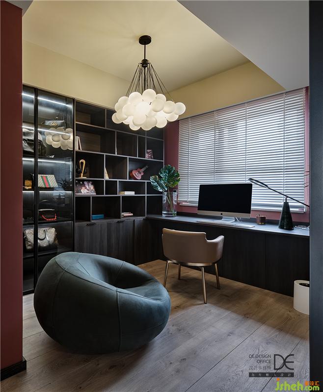 即使書(shū)房的軟萌沙發(fā)和不規(guī)則燈具足夠奪人眼球,在包包、燈光和玻璃展示柜的絕配組合下,也只能成為配角。