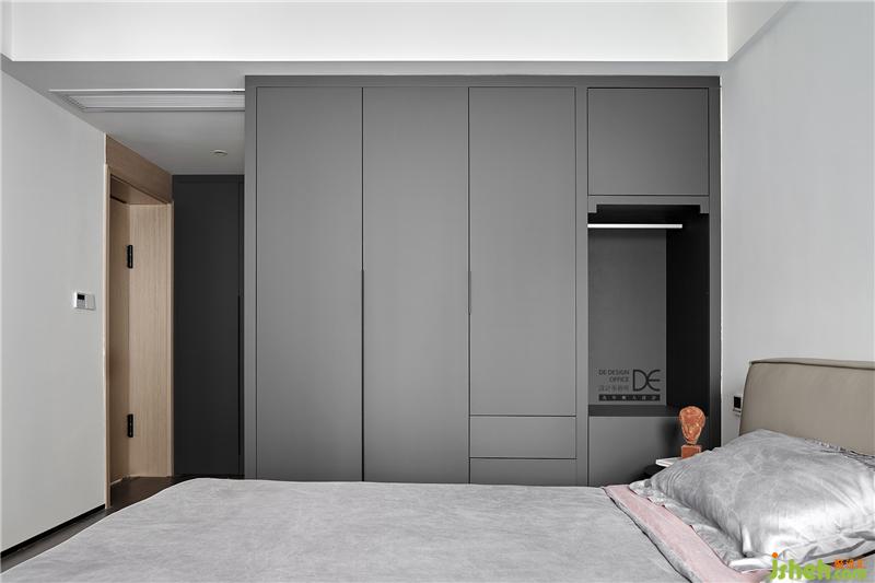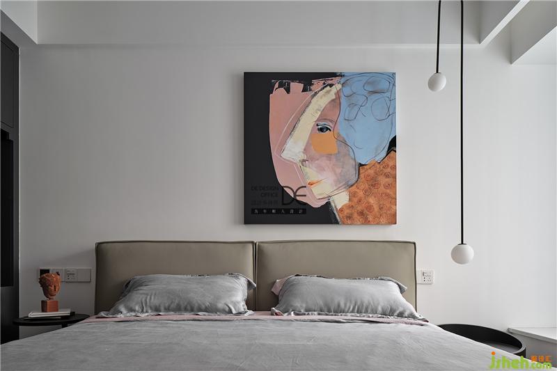 在顏色豐富的藝術(shù)裝飾畫和深灰色柜子的碰撞下,讓走進(jìn)主臥的人眼前瞬間一亮,干凈清爽的床頭和藝術(shù)畫、吊燈完美地融合在一起,讓空間張弛有度。