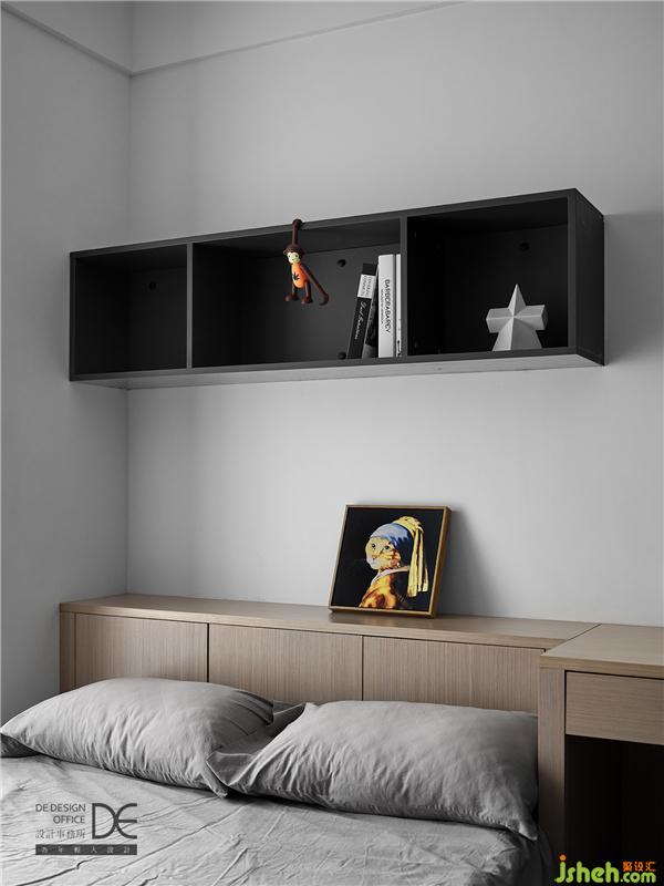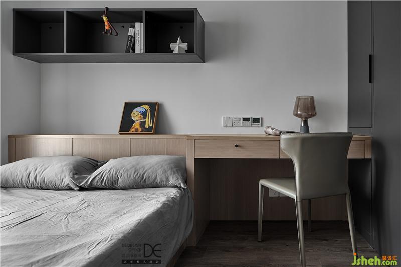 次臥白色打底,木色和深灰色碰撞。以榻榻米的形式設(shè)計(jì)整個次臥,床頭靠背和書桌形成一個整體,讓空間更有延展性。