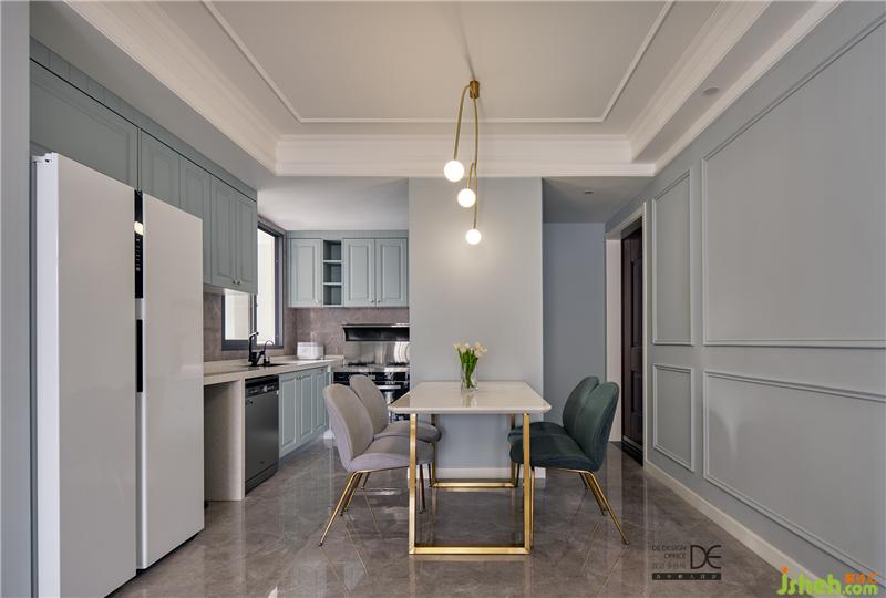 L型廚房操作臺(tái)面節(jié)約空間,大理石花紋地磚配上墻面線條造型讓空間更具層次,同時(shí)拉伸視覺(jué)效果。金屬燈具、餐椅的加入,讓空間更顯質(zhì)感。