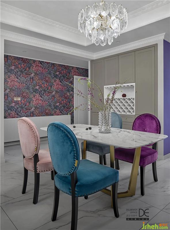 為了保證整體空間的層高,客廳采用的是邊吊,沒(méi)有復(fù)雜的造型,搭配造型吊燈;爵士白大理石地面搭配著墨綠色和紫色的沙發(fā),讓整個(gè)空間一下就變得非常靈動(dòng)。