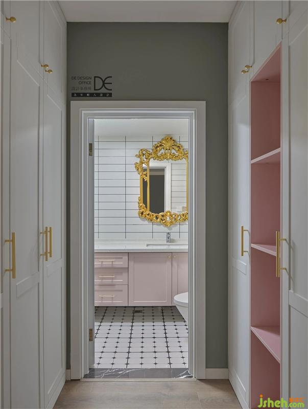 與主臥色系不同,內(nèi)含的衣帽間采用了粉白色系,搭配起來并無奇怪和突兀,相反,使整個(gè)空間看起來更加有層次。