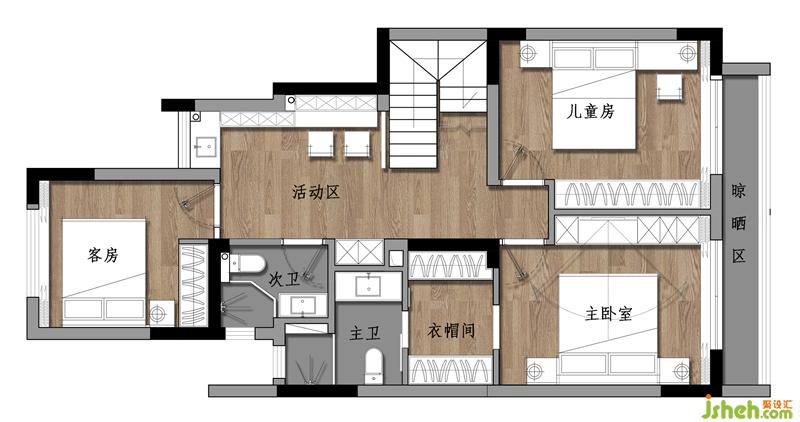 2)房間需要四室,在滿足五口人的功能需求上,還希望有一間客房和一間書房;