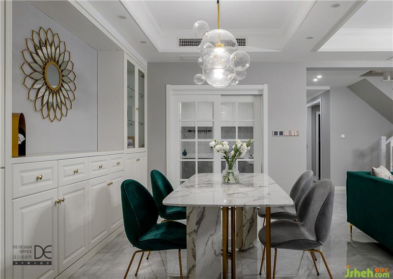 白色頂面搭配灰色大理石地磚,層次分明;壁柜、餐桌、透明燈具均采用白色系,搭配墨綠色桌椅和灰色桌椅,融入部分金屬元素,整個(gè)餐廳在配色上相互呼應(yīng)與融合。