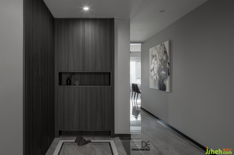 入戶的隔墻打開,沒有固定的隔絕,讓視覺空間得以延伸??臻g的分區(qū)不以固定的隔斷來分區(qū),地磚鋪貼讓空間自然的區(qū)分。深色的木紋讓空間配色更顯質(zhì)感。