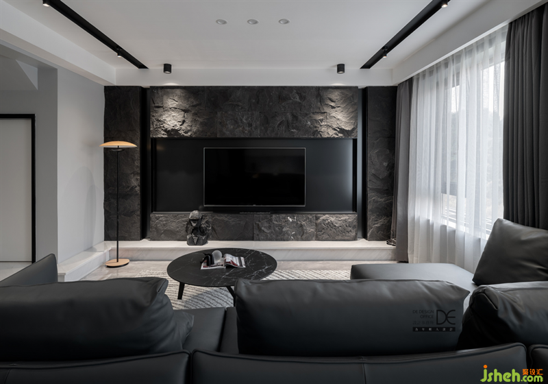 客廳和墻頂?shù)脑煨?,以對稱的形式來呈現(xiàn),簡潔的黑色燈槽在墻面得以延伸。