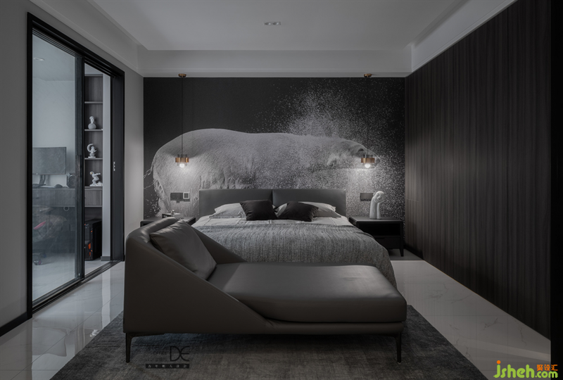 主臥的整體色調(diào)采用遠(yuǎn)比公共區(qū)域的色調(diào)深,大面積的藝術(shù)墻布和深木紋的飾面,讓空間更顯靜謐穩(wěn)重。