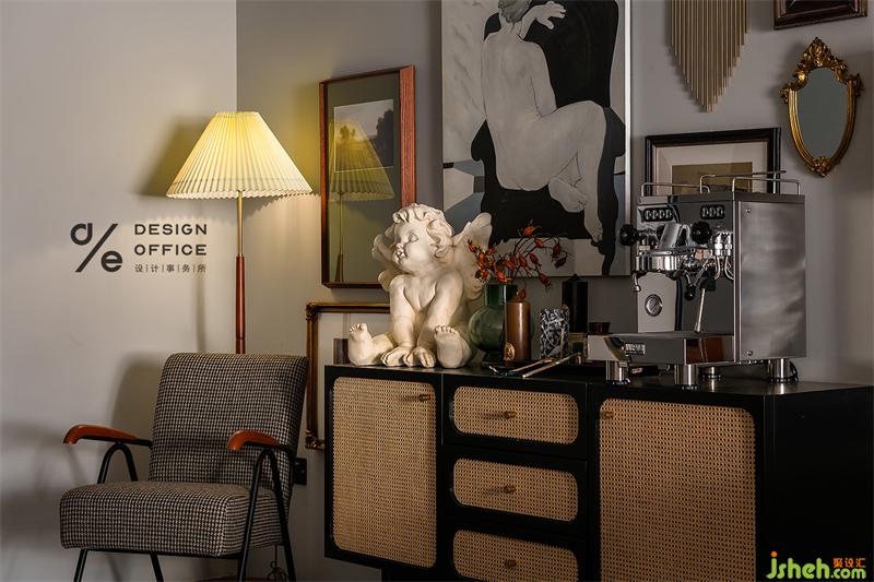 空間整體看似隨意,事實(shí)上所有物件的擺設(shè)都是業(yè)主用心設(shè)計(jì)布置,呈現(xiàn)出戲劇化的藝術(shù)魅力。小天使雕塑、中古的小家具、富有韻味的器物飾品與略帶復(fù)古的情節(jié),在空間中演繹著活潑生動(dòng)的合奏。
