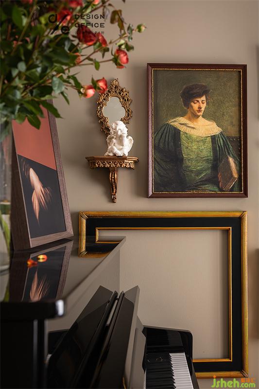 窗外是藍藍的天空,屋內(nèi),被微風輕撫的多頭玫瑰淡淡的散發(fā)著若有似無的香味,精致得體的美好讓人享受當下;文藝復興的裝飾畫傳遞出對藝術(shù)的思考;托腮思考的小天使雕像安靜地待在黃銅托盤鏡中,享受藝術(shù)熏陶。獨坐在鋼琴上,家的樂章在緩緩的彈奏中沁入心間。