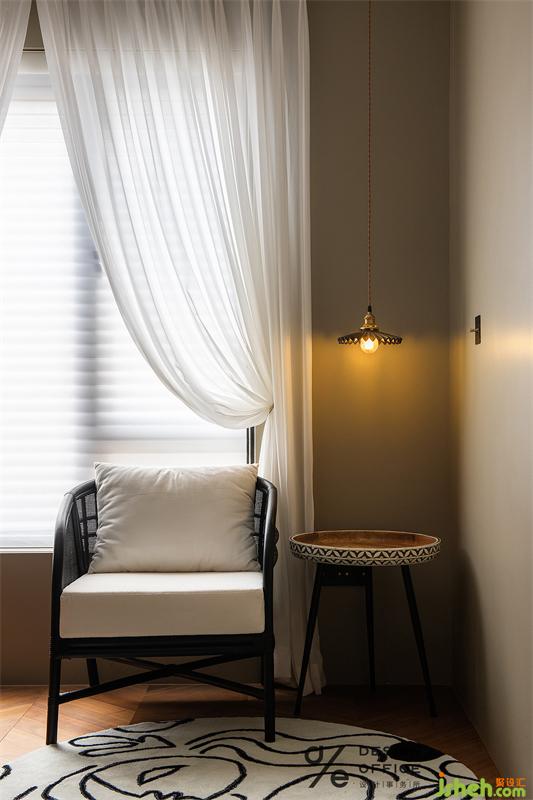 書房的一角,復古的黃銅吊燈旁置放了一把黑色實木椅,充滿質(zhì)感與復古,這些都是業(yè)主旅游所淘回來的「寶藏」,地毯抽象的線條讓視覺無限延展。坐在燈下,氤氳的暖色,配合自然的光線,烘托出意味深長的文藝片故事,讓人逐漸地釋放出更多的情緒。
