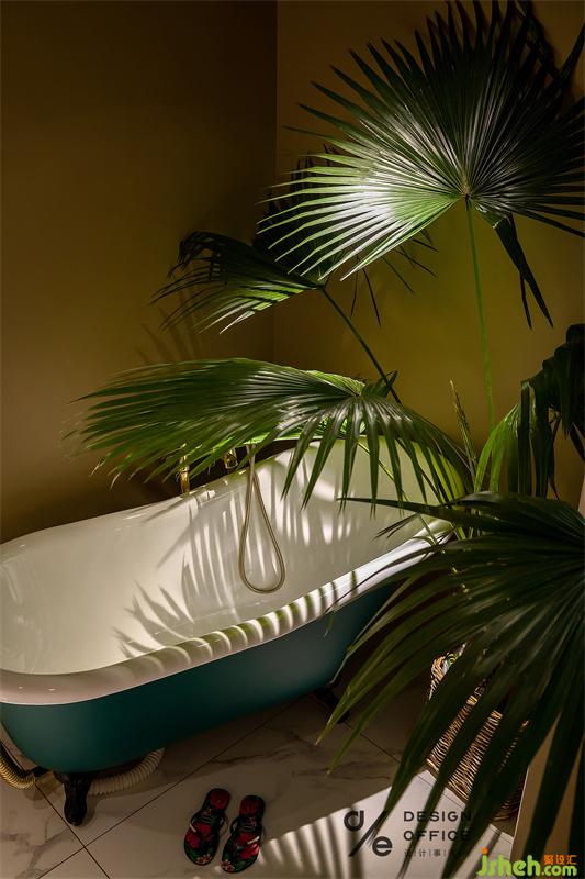 推開浴室Vintage 質(zhì)感的黑色木門,一種華麗的眩暈感撲面而來,獨特的墨綠色的浴缸讓人過目不忘,蒲葵帶來的綠意從進入的那一刻便散發(fā)著猶如海邊度假般的悠閑氣息。