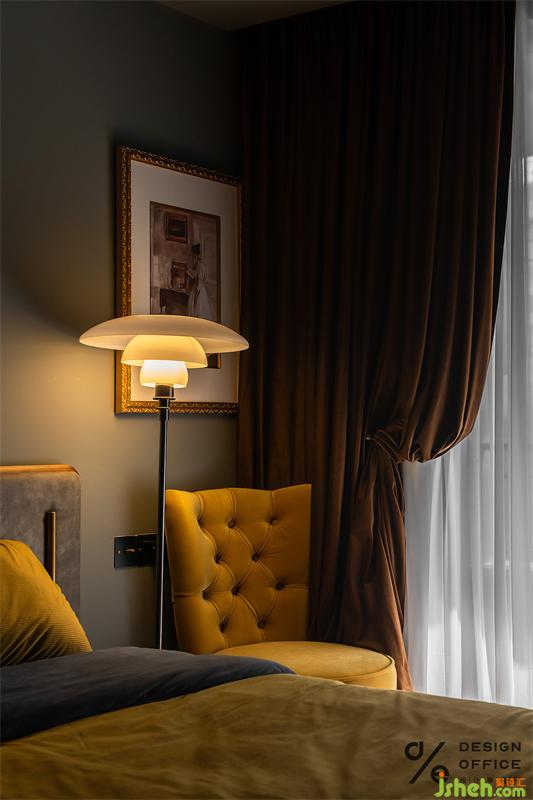 對于長輩房和小孩房,設計師則根據(jù)各自不同個性與喜好進行設計。老人房沿用大地色溫暖的基調(diào),在混搭風的基礎上做減法省去不必要的繁瑣,搭配柔和的木質(zhì)、絲絨材質(zhì)的軟裝,綠植的點綴增添了輕松和舒適的感覺。朦朧的光暈讓人置身于情境之中,心寄靜謐。