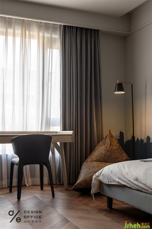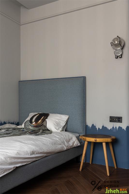 深藍色不規(guī)則涂鴉墻面讓整個臥室充滿了藝術(shù)化的極簡趣味,搭配布藝的床頭更具時尚格調(diào)。極簡的桌椅和復古情懷的落地燈交相呼應,泛黃的燈光映照著鮮活靈動的青春氣息。