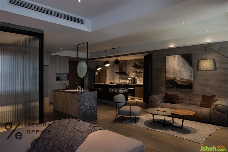 設(shè)計(jì)師打破傳統(tǒng)的布局,以全新的開(kāi)放式空間帶來(lái)更多的自由流通感,客廳兼書(shū)房于一體,休閑與辦公都在一個(gè)空間存在,臥室無(wú)門設(shè)計(jì),主臥與客廳用半墻隔斷,一人居無(wú)需擔(dān)憂空間在時(shí)間上的分配不均,可以更隨心所欲。
