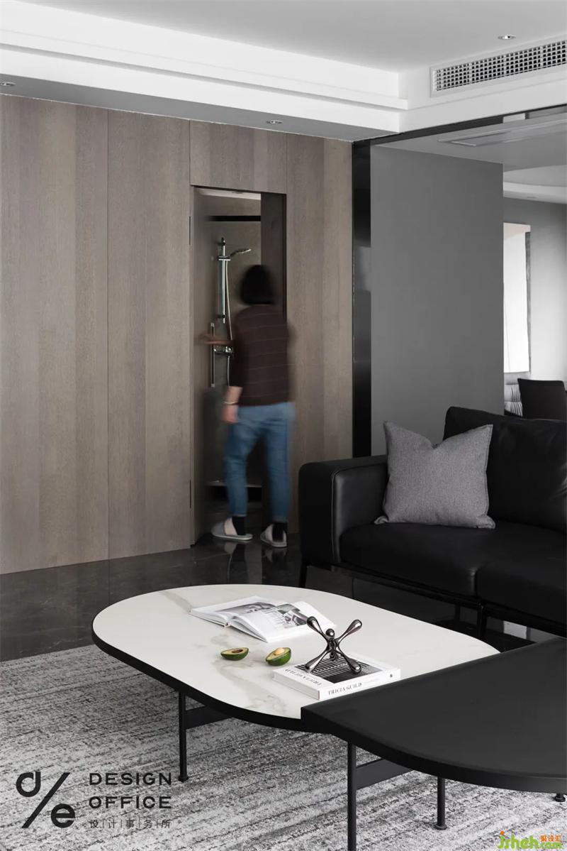 客廳與次衛(wèi)生間的連接采用隱形門,采用木飾面的設(shè)計(jì);在不影響空間的整體布置前提上,將門+木飾面組合,設(shè)計(jì)成隱形門,讓空間顯得更加舒適自然。