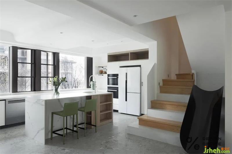大餐桌是一日三餐和家人聊天的好去處,相鄰的是用玻璃隔斷的多功能室;而另一邊就是超大的開(kāi)放式廚房,是烹飪美食的地方,也是早晨用餐和喝咖啡的絕佳之地。