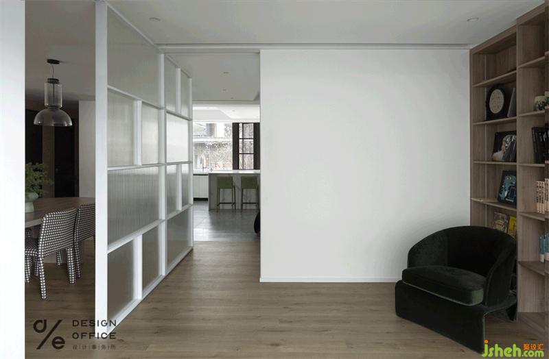 把門(mén)關(guān)上,投影幕布放下來(lái),用專業(yè)級(jí)投影儀播放電影的時(shí)候,這里就是一個(gè)影音室;當(dāng)朋友需要留宿時(shí),放下折疊床,將兩扇門(mén)關(guān)上,這里就變成了客房;而平時(shí),多功能房?jī)缮入[藏式滑門(mén)藏著的時(shí)候,餐廳和多功能房之間就只有一塊玻璃隔斷,這里也就成了一個(gè)開(kāi)放式書(shū)房。