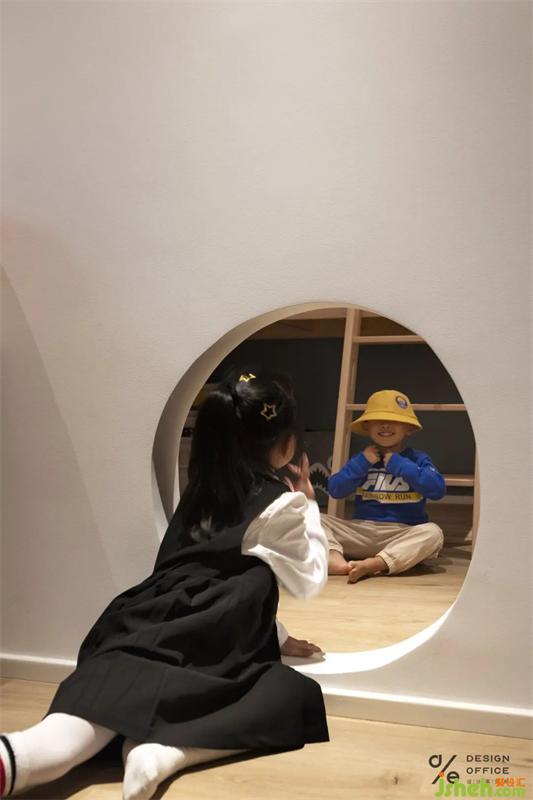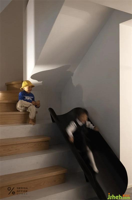 階梯與滑梯同在的設(shè)計(jì),也是設(shè)計(jì)師送給孩子們的禮物。設(shè)計(jì)師參考了游樂(lè)場(chǎng)的一些設(shè)施,還設(shè)置了一根到底的柱子,讓小朋友在攀爬的過(guò)程中有東西可以抱著旋轉(zhuǎn),保證了玩耍的安全,這里已然是姐弟倆的小小游樂(lè)場(chǎng)。