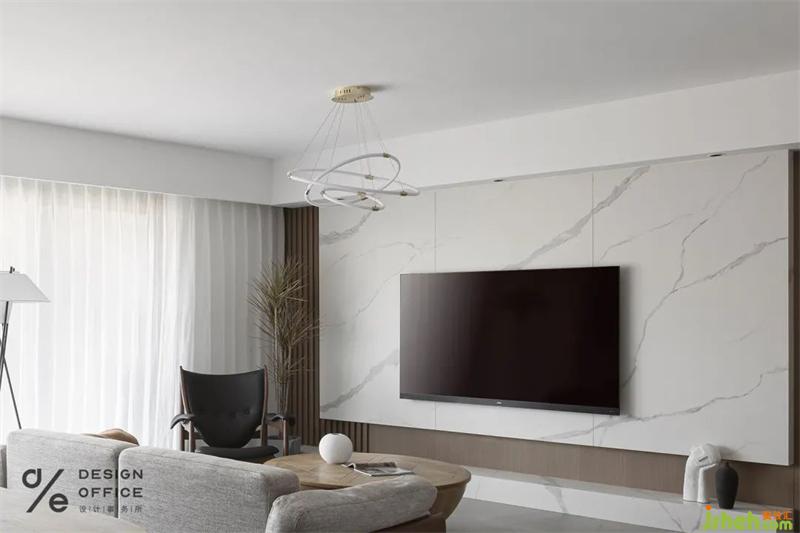 隱形門的設計延長了電視墻的同時也讓空間更加的干凈整潔,石材的造型又把視覺拉回了電視的中心。