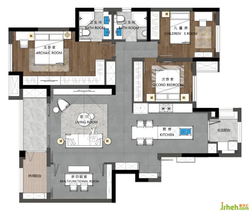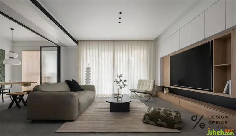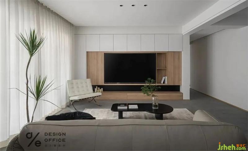 柜體式的電視墻,過道內凹式柜體處理,為業(yè)主創(chuàng)造了足夠多的儲藏空間。開放式的廚房和半開放式的多功能室,讓客廳顯得更加的寬敞,互動性更強。