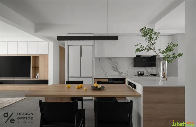 沒有做傳統(tǒng)的封閉式廚房,開放式的廚房增加社交屬性,同時(shí)還保留了獨(dú)立的生活陽臺(tái)。石材上墻,去掉了擋水線等不必要的處理,廚房顯得更干凈、整潔,也更方便清潔。