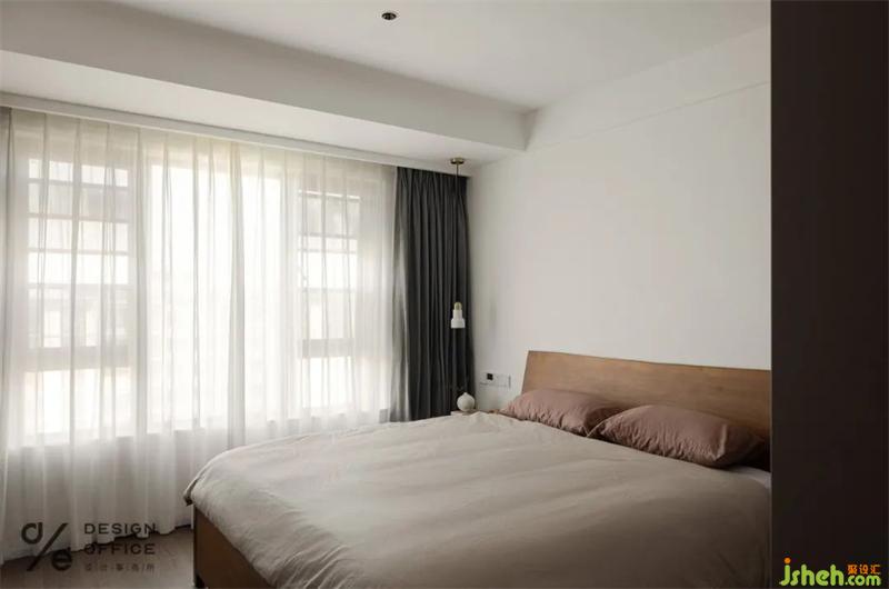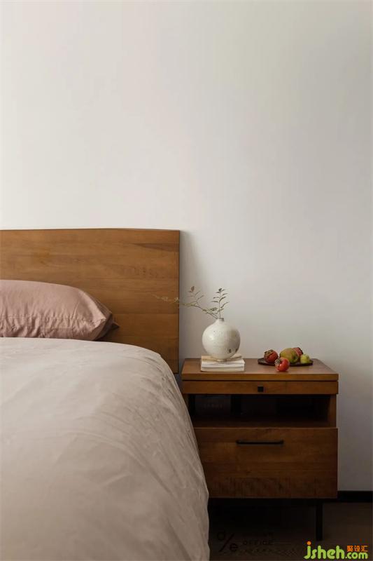 把公區(qū)自然舒適的狀態(tài)延續(xù)到臥室當(dāng)中,墻面沒有做過多的修飾,更多去關(guān)注的是生活化的一些場景。所以選用了跟公區(qū)風(fēng)格一致的原木床,搭配素色床品,充滿韻律感,細(xì)膩而耐看。