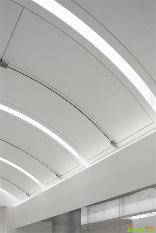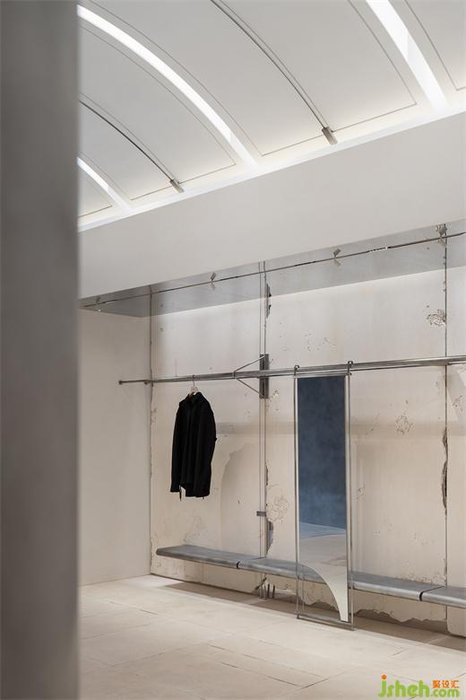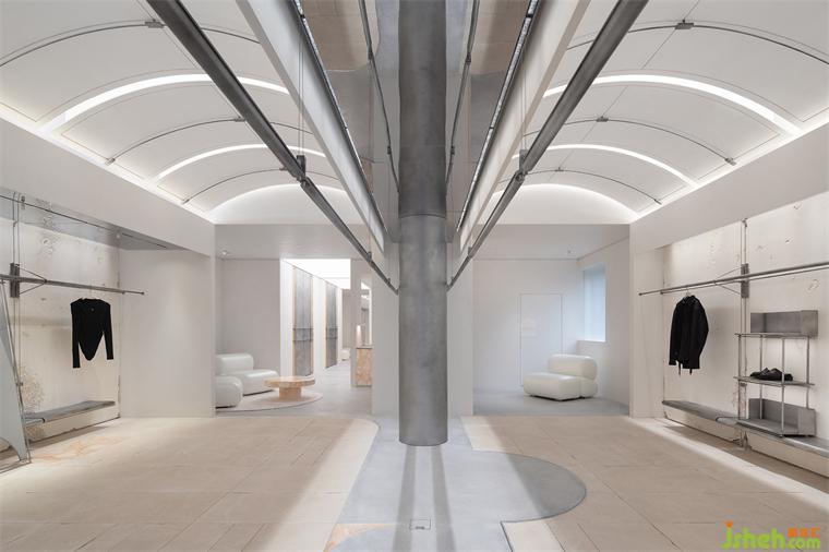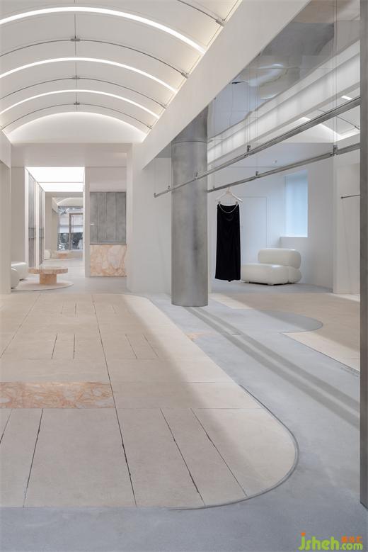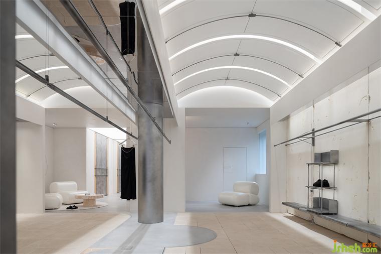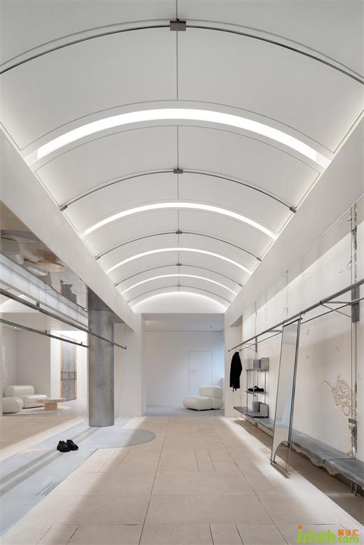 入口的弧形石材門框,是對(duì)“裁剪”運(yùn)動(dòng)軌跡的提??;門把精細(xì)穿插的結(jié)構(gòu),展廳設(shè)計(jì)是對(duì)“縫紉機(jī)”穿針引線的表達(dá)。細(xì)微之處,關(guān)于品牌精神的具象探索,正逐一展開。