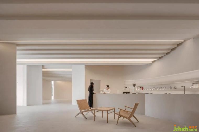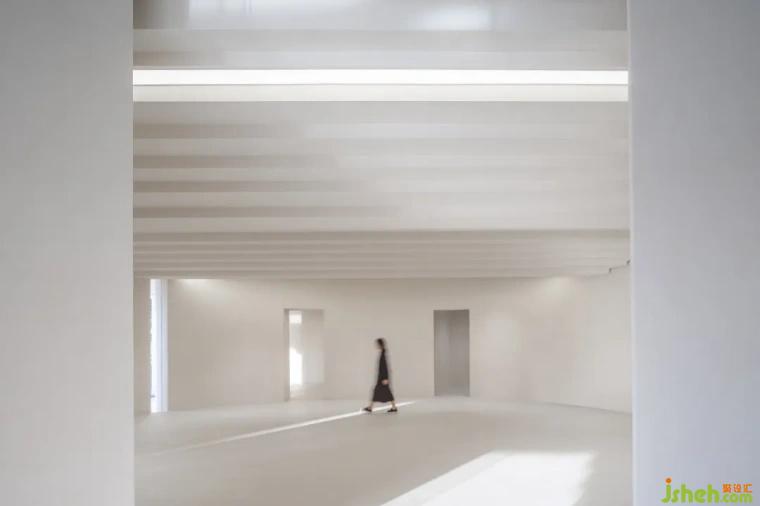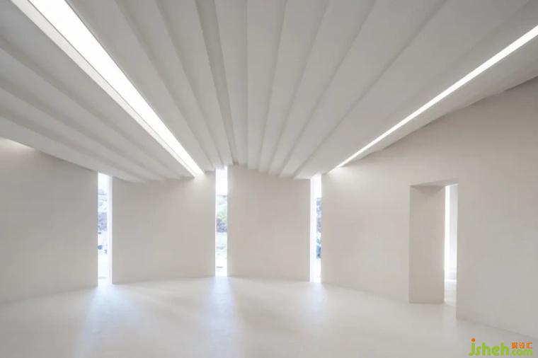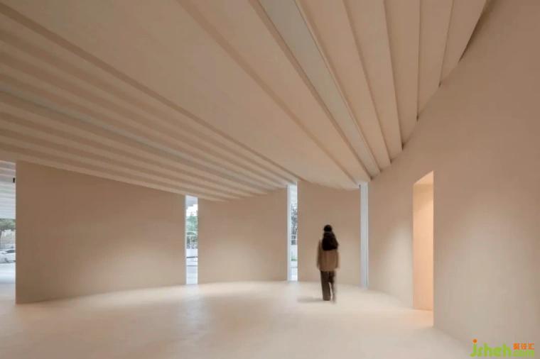 在首層空間,碩大的頂面灰空間提供人們交流、對(duì)話、關(guān)懷與問候等開放性場(chǎng)所,它體現(xiàn)當(dāng)?shù)厝藢?duì)生活的期望,以及對(duì)彼此的重視,而這樣的情感交換提升當(dāng)?shù)鼐用駥?duì)藝術(shù)與美的想像,替生活置入的強(qiáng)大能量。該建筑的鋸齒狀頂面聯(lián)系數(shù)個(gè)藝術(shù)展覽空間,頂面下方由數(shù)個(gè)曲面墻體支撐,創(chuàng)造出有如中國(guó)園林般曲徑通幽,結(jié)合從外部滲透進(jìn)來的光影,讓自然與藝術(shù)相互對(duì)話,呈現(xiàn)一種永恒性的空間體驗(yàn)。二層空間是開放式辦公,延續(xù)一層藝術(shù)文化展覽,辦公空間的形式與體驗(yàn),不同于常規(guī)工作場(chǎng)域,設(shè)計(jì)透過曲線墻體的起伏,自然而然分隔與連接數(shù)個(gè)文化辦公場(chǎng)所。自由延伸的墻體,帶給工作人員有如美術(shù)館自身的純粹感,不僅強(qiáng)化辦公環(huán)境的創(chuàng)意啟發(fā)與文創(chuàng)設(shè)計(jì),也增強(qiáng)工作之間的交流與討論,創(chuàng)造文化活力并注入藝術(shù)氛圍的工作場(chǎng)所。