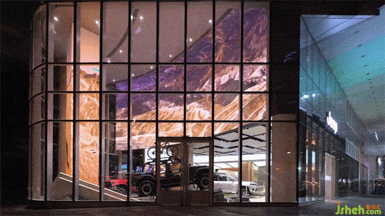 項(xiàng)目位于上海靜安寺商圈晶品廣場(chǎng)一層,主入口毗鄰愚園路和常德路交叉路口?;陧?xiàng)目獨(dú)特的區(qū)位優(yōu)勢(shì),三面全景的落地窗作為主要臨街展示界面,INGROUP在設(shè)計(jì)中充分關(guān)注對(duì)外展示性,Jeep探享中心設(shè)計(jì)利用場(chǎng)景化的表達(dá)和大面積動(dòng)態(tài)的自然環(huán)境影像,敘述Jeep野性的品牌基因,使得產(chǎn)品展示與沿街人流在視覺上互相打通,吸引人流進(jìn)店。