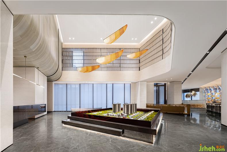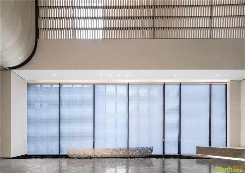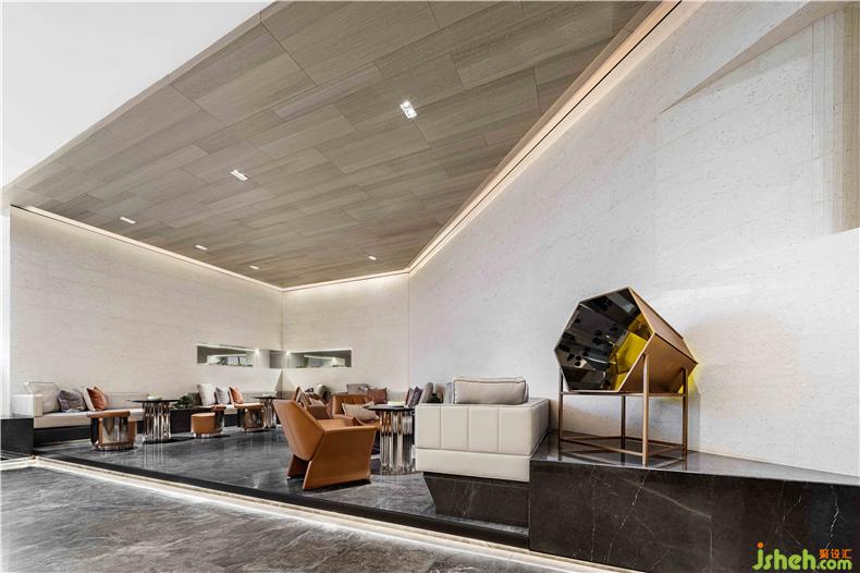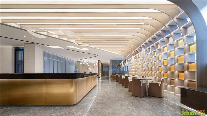 灰白、雅棕是深談區(qū)的主色調(diào),漸變展示書架使得空間功能分區(qū)柔和,室內(nèi)設(shè)計(jì)師星星點(diǎn)點(diǎn)的光線折射其中,熠熠生動(dòng),清雅透亮。流麗與典雅滲透在洽談空間的每一處。