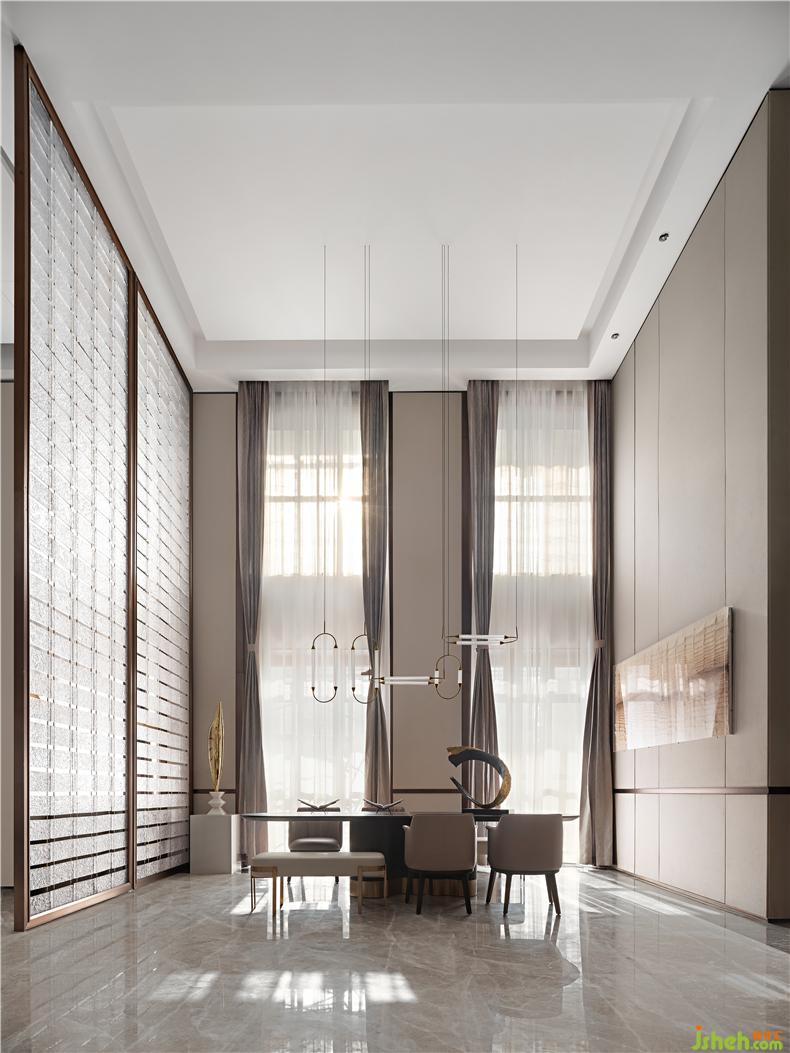 我們認(rèn)為,對自然與人文的追問,亦是對時(shí)間刻度的一種探索。在簽約區(qū),設(shè)計(jì)透過對自然地緣與人文情致的解構(gòu)、應(yīng)用,營建空間的大輪廓與小細(xì)節(jié),環(huán)環(huán)相扣的幾何燈飾、鵝黃漸變的藝術(shù)掛飾、裝修設(shè)計(jì)極具秋色詩學(xué)的精致花藝,詮釋著空間的美學(xué)尺度。當(dāng)陽光漫入空間,光影斑駁,有時(shí)令空間的一切界限分明,偶爾又界限模糊,詩意地與自然呼應(yīng)共生